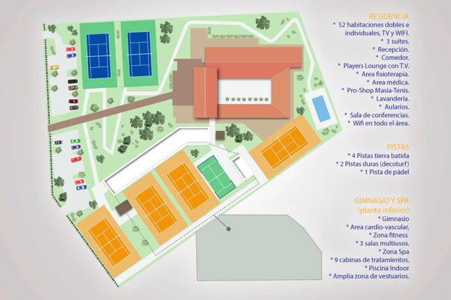 Desarrollo de plano de instalaciones de los dos centros de Masia Tenis Academy. Academia de tenis de alto rendimiento ubicada en la ciudad de La Eliana.