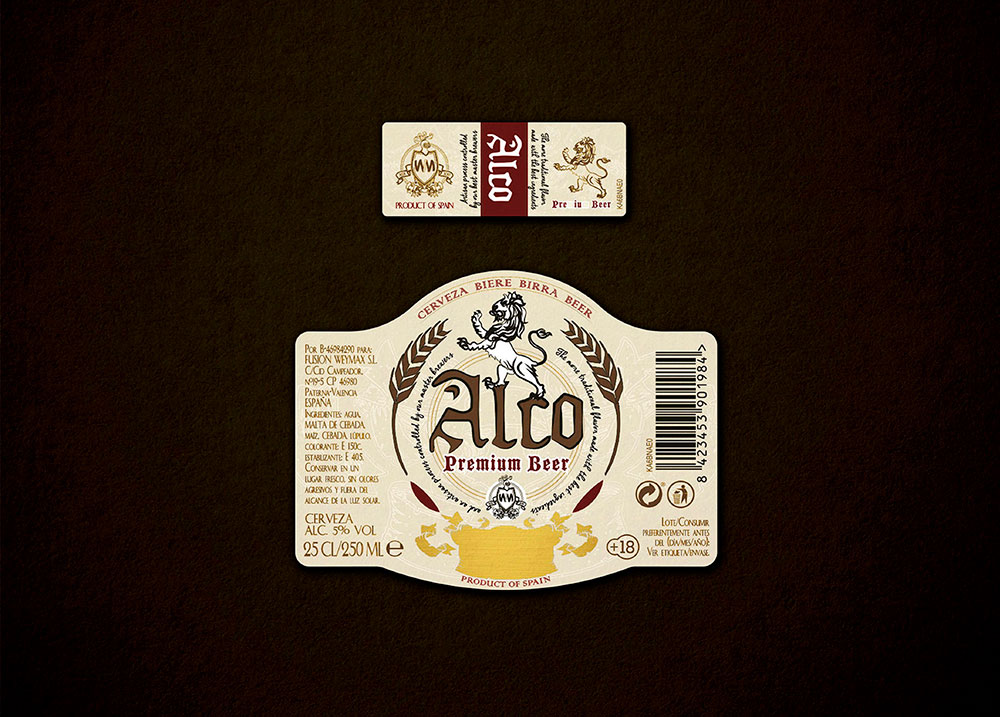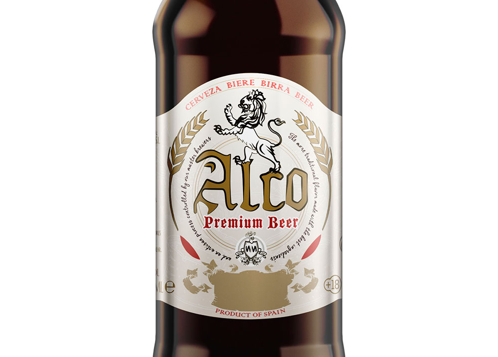 Propuesta de diseño para marca de cerveza Alco, en formato botella de cristal, de la empresa Fusion Weymax para su distribución en el mercado asiático.