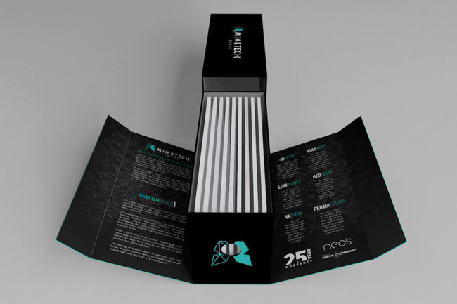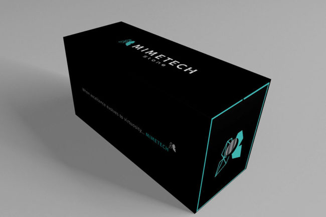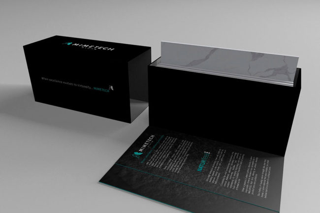 Diseño y desarrollo de caja de muestras para Mimetech Stone, una de las marcas del fabricante asiático Fasa Stone para su distribución en Estados Unidos. Caja con despliegue interior que simula las alas de la mariposa saliendo de la crisálida, en asociación a la imagen de marca.