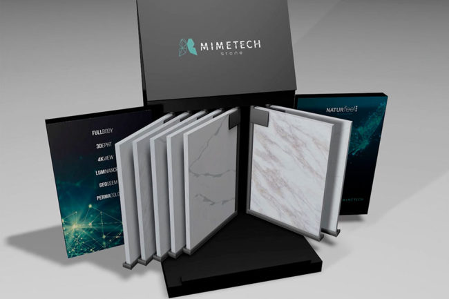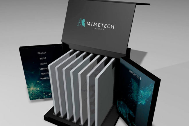 Diseño y desarrollo de caja de muestras para Mimetech Stone, una de las marcas del fabricante asiático Fasa Stone para su distribución en Estados Unidos. Caja desplegable y con sistema de guías abatibles que la convierten en un expositor de las propias muestras.
