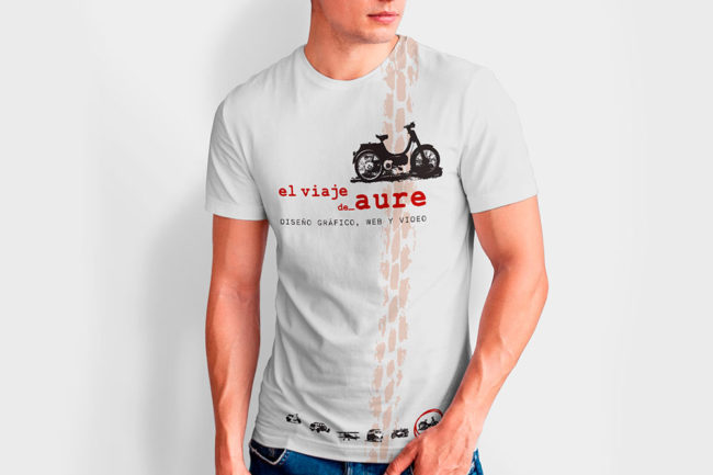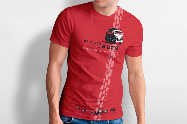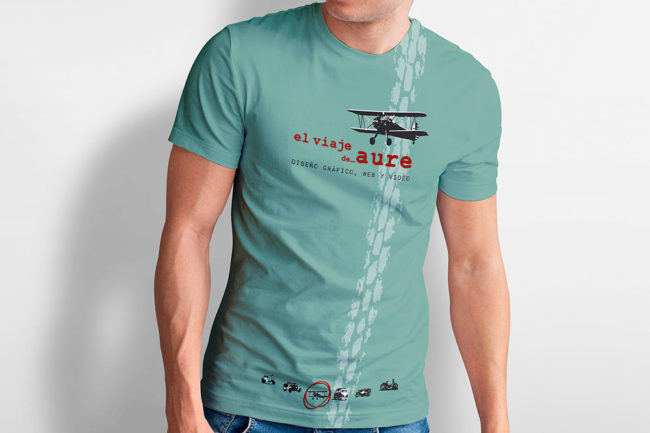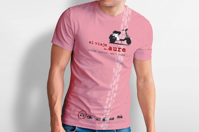 Propuesta de diseño de camisetas promocionales con distintos motivos gráficos y diferentes colores, de El viaje de Aure para obsequio a clientes y colaboradores.