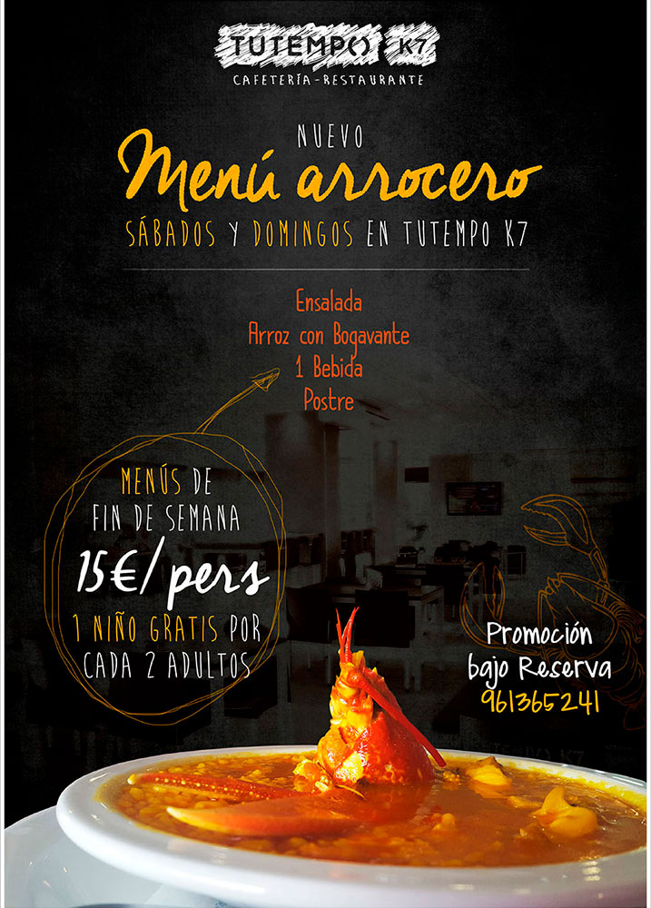 Cartel para los menús de arroz del restaurante de Tutempo K7, en su segunda etapa, donde se puede ver una clara apuesta por la calidad a buen precio.