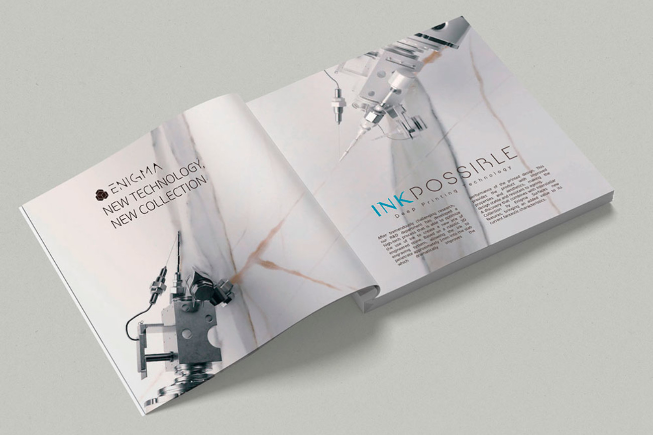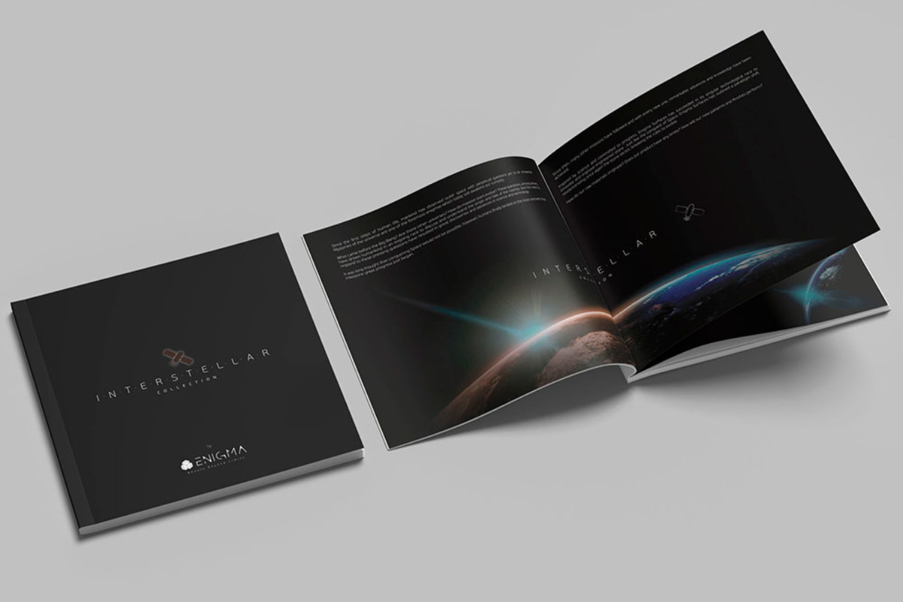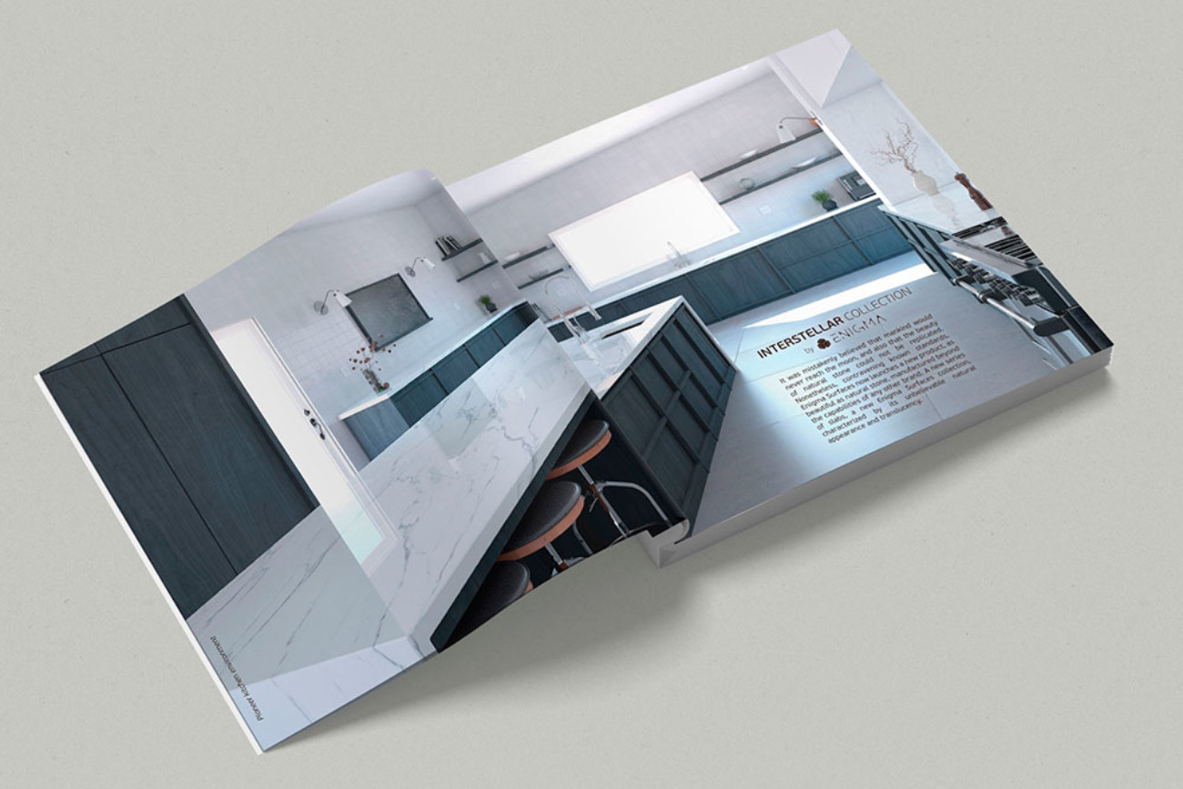 Maquetación gráfica del Catálogo de encimeras para cocinas Interstellar, dentro de la marca Enigma, desarrollada por el fabricante asiático Fasa Stone y dirigida al mercado americano.